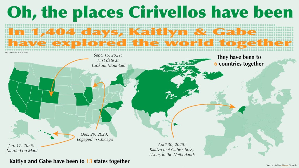 My sister got married in January with just immediate family, but she’s throwing a larger reception this summer and asked me to design some decorations. I created this infographic to show where she and her husband have traveled together. It includes a dot chart for how many days they’ve been together and maps highlighting states and countries they’ve visited.